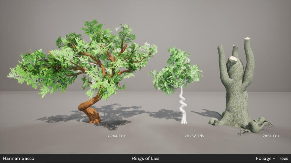 Another role I performed was as a foliage artist. I created an array of trees to set dress the forest that the player ventures through. I aimed to create trees that would provide enough variety to make the forest still have contrast while not making them stand apart too much from each other. We referenced trees that could be found in a forest in Ireland. I then created textures that could be used on any of the trees, as well as a few different kinds of leaves to create variety in the landscape. I also created a few trees that incorporated the more magical feel of the game, making them twist in a spiral form to coincide with the games theme of rings.